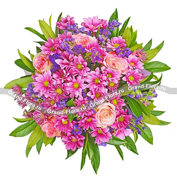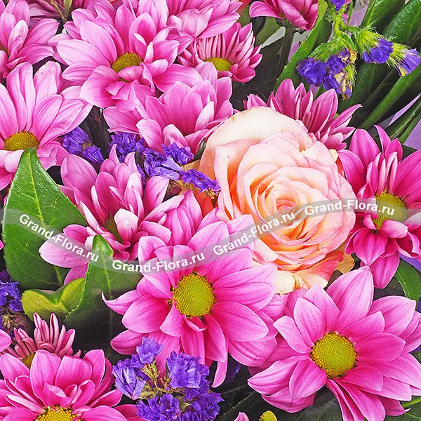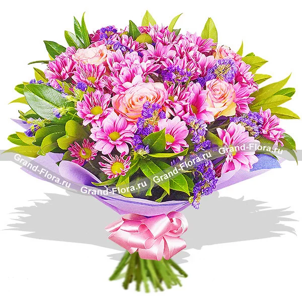 Хризантема кустовая фиолетовая - 15 шт., роза розовая - 11 шт., статица - 7 шт., салал, фетр фиолетовый, бант.